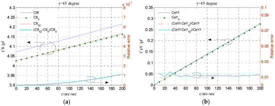 By considering the relative tiny tilt displacement of a precision spindle and reasonability of the sensor structural parameters, the variation range of the term kρ/a was set to be [0, 0.2]. As shown in Figure 12, the approximate error IGeapp.error is relatively smaller over the range of the parameter terms cos(φ + γ) and kρ/a. According to the simulation model parameters of the sensor [], the ratio of the term kρ/a is about 0.04 with the tilt displacement of 200 arc-sec; thus, the error IGeapp.error remains no more than 0.2% within the whole range of the term cos(φ + γ), i.e., the entire phase region. Figure 13a compares the theoretical and simulated capacitance of the end part electrode. The theoretical capacitance is integrated by the integrand term with a second-order approximation (C8tl2). It can be observed that there is little difference between C8tl2 and the counterpart using first-order approximation (C8tl), which is also the same for the theoretical value of the CeY (the differential output capacitance of the EPEG) shown in Figure 13b. Besides, similar to the theoretical value of the CrX calculated by the expression with third-order approximation (see in Figure 11), the difference between the theoretical capacitance CeYtl and the simulation one CeYf remains roughly unchanged relative to the simulation value, which indicates that the theoretical capacitance of the end part electrode solved by adopting IGetl as integrand can meet the design needs for relatively accurate results.