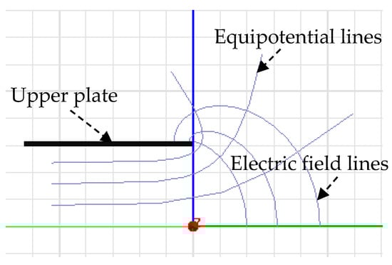 Due to the existence of diverging electric fields in the plate edges in Figure 14, i.e., the “fringe effects” [], the measured capacitance of a sensor contains some additional capacitance introduced by the fringe effects. As for the sensor electrode with finite dimensions, the variation in its output capacitance is relatively small, especially for the measurement of tiny displacement. As such, the influence of the fringe effects cannot be neglected.