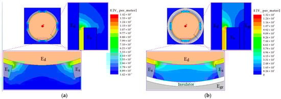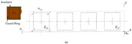 Figure 15 shows the distribution of the electric field between the cylindrical excitation electrode (Ed) and curved sensing electrodes (Es) for the fundamental configuration of the radial curved plate capacitor. It can be seen that the electric field concentration appears in the junction of the inner circle face of the curved plate and its side face. As shown in Figure 15a, a different intensity distribution of the electric field between the Ed and the side face of the Es and its adjacent outer circular face formed along the radial direction. Once the equipotential guard ring (Egr) is employed outside the Es, the electric field distribution between the Ed and the outer circular face of the Es and between the Ed and local region of the side face near the outer circular face can be eliminated, as shown in Figure 15b. The Egr is also classically named Kelvin guard-ring.