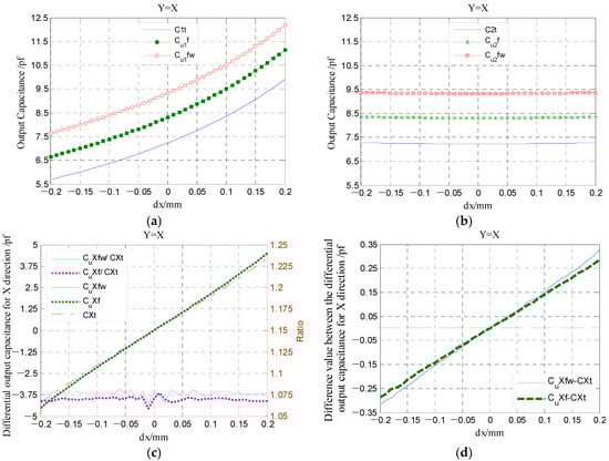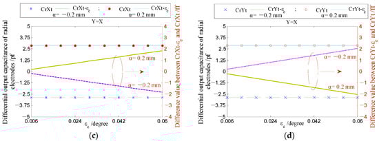 The changing of the radial differential output capacitance under the different tilt angle εe: (a,c) The X-direction; (b,d) the Y-direction.