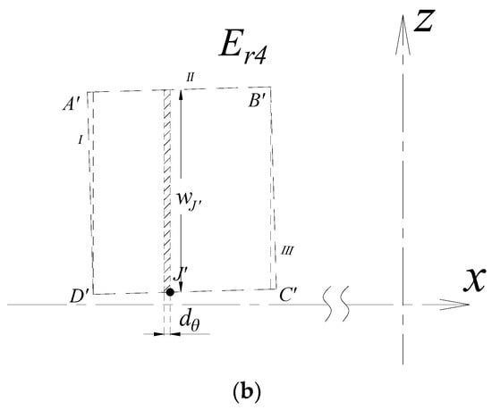 As shown in Figure 18b, by taking a micro element with arc length dθ on the boundary D′C′ of the electrode Er4, the axial length wJ′ of the electrode at this location can be considered as the function of the polar angle θJ′ at point J′. The solution region is vertically divided into three parts according to the constraint boundary of the length wJ′, and the corresponding calculation function can be expressed as follows: