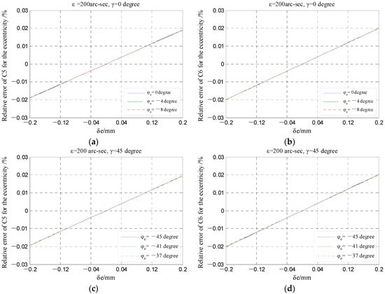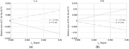 By referring to the structural design of the T-type CS, the range of the tilt angle εe was set to be [0.006, 0.06] deg (about 200 arc-sec) in the numerical simulation using Matlab. A tiny circumferential displacement of the cylindrical electrode was produced due to the tilt angle εe, which produces a relative error of the output capacitance under the radial displacement along the same direction. The dependence of the relative error on the angle εe is shown in Figure 19. For the single electrode, the influence of the tilt angle εe on the output capacitance is very small, with respect to the amplitude of the relative error.