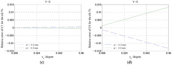 Relative error variations in the output capacitance of cylindrical electrodes under the different tilt angle εe: (a,c) The 1st quadrant; (b,d) the 4th quadrant.