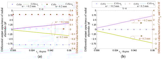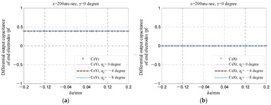 From Equations (27) and (28), it can be known that the tilt displacement ε and yaw angle γ are obtained based on the calculated differential output capacitance of the EPEG (CeY, CeX). As shown in Figure 24, under different yaw angle γ, the produced coaxiality error δe and phase angle φe do not cause the changing of the capacitance CeY and CeX, which indicates that the measurement of the rotor tilt displacement is basically not affected by the coaxiality error of fan-shaped electrode.