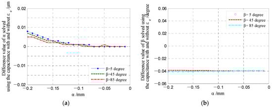 Figure 20 presents the dependence of the differential capacitance on the tilt angle εe. It can be known that the influence of the tilt angle εe on the differential output capacitance of the REG is slightly larger. By considering the rotor of run-out in the given directions (β = 5°, 45°, 85°), the differential output capacitance (CrXt-εe and CrYt-εe) can be calculated by the capacitance of single electrodes under the angle εe. The difference between the differential output capacitance under the angle εe and the counterpart under an ideal position (CrXt and CrYt) could be transformed to the difference of displacement parameters, utilizing Equations (33) and (34). The difference in the displacement parameters (magnitude α and phase angle β) are shown in Figure 21. It can be known that the produced tilt error εe of the cylindrical electrode only generates a certain deviation of solving the phase angle β, which is consistent in different displacement directions (brings about the overall phase advance or lag of the displacement trajectory); the effect of tilt error εe on solving the radial displacement α can be neglected, especially for the measurement range of less than 0.1 mm.