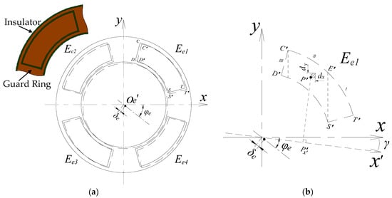 Due to the position error between the shape boundary of EPEG and the sensing electrodes and the manipulation precision, there may be an eccentricity between the geometric center Oe′ of the fan-shaped electrodes in the EPEG and the medial axis of the stator (the origin position of the coordinate system). As shown in Figure 22a, δe denotes the magnitude of the eccentricity, and φe is the phase angle. δe is the coaxiality error of the fan-shaped electrode.