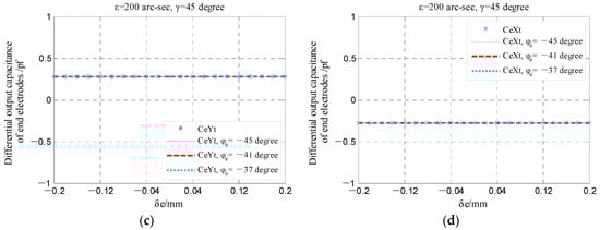 The changing of the end part differential output capacitance under the different coaxiality error δe: (a,c) The component around the y-axis; (b,d) the component around the x-axis.