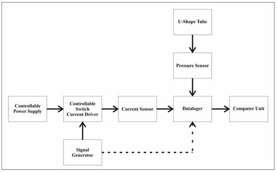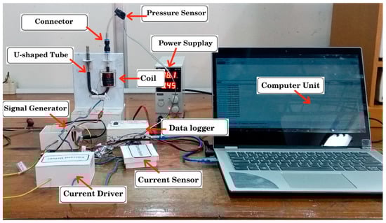 In addition, the pressure generated by the MRF at the end of the U-shaped pipe was detected using the MPX5010DP pressure sensor [] and sent to the data logger to be recorded by the computer. The data logger used CuteCom software and an Arduino that was configured to sample data readings from sensors. Figure 2 and Figure 3 show the block diagram and configuration of the test equipment used in the study.