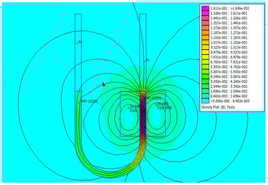 Due to the fact that it is not easy to measure magnetic field strength in the research configuration, in this case, the magnetic field strength is represented in the form of an electric current. As has been mentioned in several articles [,,,], the magnitude of magnetic field strength in a magnetic coil can be predicted using FEMM software. Therefore, in this case, the strength of the magnetic field was directly proportional to the electric current flowing in the magnetic coil.