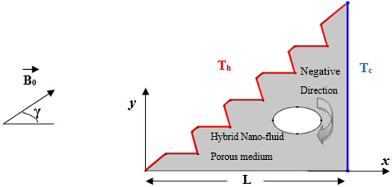 This study provides numerical insight into convection, owing to the magneto-hydrodynamic flow of a hybrid nano-fluid in a porous triangular enclosure described by the Darcy–Forchheimer–Brinkman model. The configuration presents a right-angled triangular cavity of 1m length with a zigzagged inclined wall and an elliptical rotating cylinder along the x-direction inserted in the center of the geometry in order to investigate mixed convection; this is combined with heat transfer due to the buoyancy forces that lead tonatural convection and to the rotational velocity of the cylinder that drives forced convection. Figure 1 depicts the porous setup that is exposed to a magnetic induction, B0, detailed in Table 1, and filled with the Cu-TiO2/EG hybrid nano-fluid featured in Table 2. The right-angled wall is cold with a fixed temperature, Tc, while the inclined wall is subject to a heating source and set as Th. The base of the triangle and the cylinder are both adiabatic.