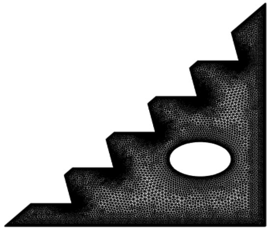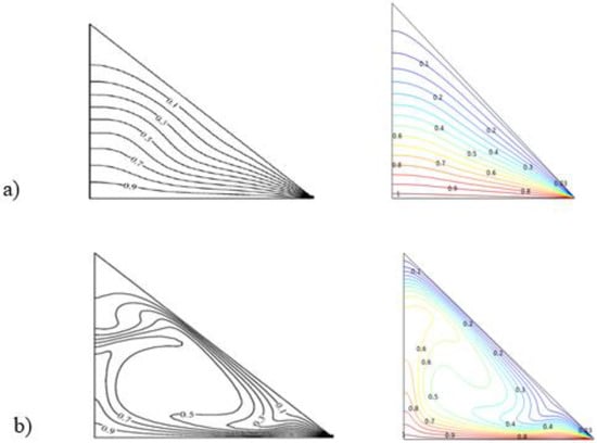 The finite-element method (FEM) was used and applied in the COMSOL multi-physics software 5.6 to solve the dimensionless governing equations presented above with the given boundary conditions. The accuracy of the present program was assessed, and the results are reported in Figure 3, which compares the current isotherms and streamlines to those of the numerical findings of [], in which natural convection was explored in a basic triangular enclosure.