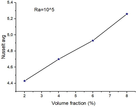 At Ra = (Figure 4), the average Nu number appears to grow with the volume fraction where natural convection significantly dominates. Augmenting the concentration of the hybrid nano-fluid corresponds to an increase in the presence of nanoparticles, both Cu and TiO2, that present enhanced thermo-physical characteristics compared to classical fluids, as presented in Table 4, particularly their thermal conductivity. It worth mentioning that these properties improve the thermal conductivity of the hybrid nano-fluid and also increment the surface area of the nanoparticles []. Therefore, Nuavg is proportional to the presence and the volume fraction of the hybrid nano-fluid, and such correlation contributes to convective transfer.