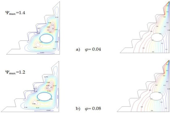 Figure 5 presents the impact of the hybrid nano-fluid concentration on heat-transfer features, isotherms, and streamlines. It is shown that incrementing the volume fraction of the nanoparticles has only a minor effect on streamline and isotherm contours, with a slight modification to the detected stream-function value. The enhanced heat transfer properties provided by the increase in the volume fraction also intensify entropy generation [,], which results in decremented stream-function values and a reduced heat-transmission rate.