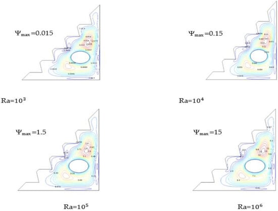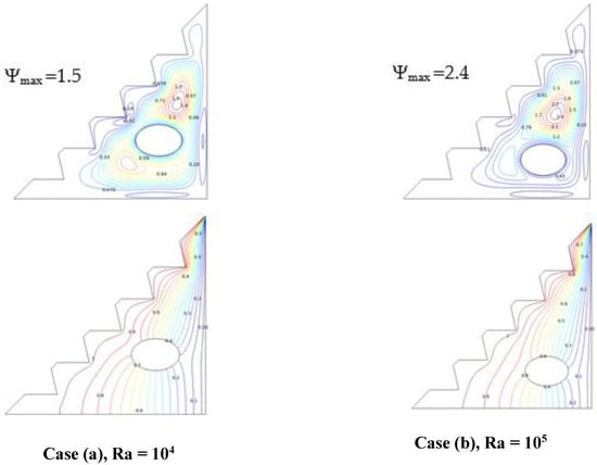 Figure 8 highlights the distinctions between the two elliptical obstacle placements for 2% of the hybrid nano-fluid and no subjection to a magnetic field. It is observed that for Ra = , the temperature distribution is directly affected by the location of the cylinder; the temperature variation in the configuration in the case of (b) provides better heat transfer, as it enables the flow to be distributed in the surrounding central section of the enclosure, with a large vortex that provides great stream-function values, which permits buoyancy forces to freely drive the hybrid nano-fluid flow, thereby significantly exploiting natural convection. In contrast to case (a), where the elliptical cylinder is positioned in the center of the enclosure, in this scenario, the flow is divided into two vortices: a large upper big vortex that offers a lower stream-function value than case (b) and a smaller one obstructed in the bottom of the enclosure, therefore obtaining less thermal transmission. According to these findings, it has been demonstrated that placing the obstacle at the bottom of the enclosure improves the heat-transfer rate.