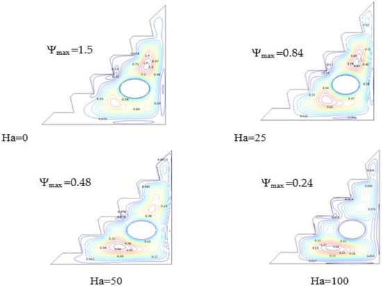 On the other hand, as shown in Figure 7, the presence of a magnetic field diminishes the convective transfer rate, as Lorentz forces inhibit the development of vortices and thus reduce the velocity of the nano-fluid and suppress the flow distribution. In the case where no magnetic induction was introduced, two large vortices were formed around the cylinder, which smoothed the flow of the hybrid nano-fluid. With an increasing Hartmann number, stream-function values were reduced as vortices shrunk in size and nearly disappeared in the upper part of the enclosure, causing the flow to aggregate towards the bottom wall. In conclusion, Hartmann number might be regarded as a limiting parameter for heat flow.