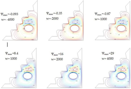 Mixed convection was investigated at Ra=, and for 4% of the hybrid nano-fluid, the findings are shown in Figure 9, which displays several streamlines, exhibiting the impact of the ellipse’s rotational velocity. A negative rotation value indicates a clockwise motion.