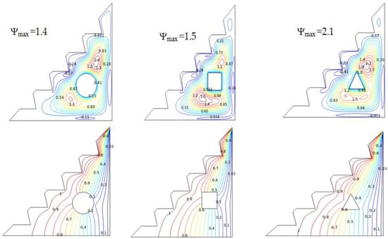 The streamlines and isotherms produced and illustrated in Figure 10 investigate the influence of several obstacles in the considered geometry on the flow distribution. The findings demonstrate that the square and circular obstruction appear to slow the flow by producing small vortices compared to the triangular obstacle, which provides increased heat-transfer since it delivers the greatest values of stream function. The two vortices arestretched around this cylinder, which provides more space for flow distribution, thereby strengthening heat transfer. Temperature variations also significantly contribute to improved buoyant forces, which drive and boost natural convection.