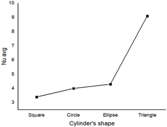 Furthermore, Figure 11 demonstrates that the triangular barrier provides improved heat-transfer efficiency by presenting the highest peak of Nuavg values when compared to the other cylinders. The geometrical features of the triangle and the uniform space provided around it make it easier for the hybrid nano-fluid to disperse, which can help amplify and alter the average Nu number and therefore convective transfer [].
