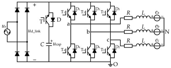 The output voltage of the diode rectifier bridge |us| and the DC-link capacitor voltage ucap waveform of existing control method are shown in Figure 3. Let Um be the AC voltage amplitude and f be the grid frequency. With the drop in diode voltage ignored, the diode rectifier bridge output voltage amplitude of the rectifier bridge is Um, and the period is TR = 1/2f. According to the size relation of |us| and UabN, a rectification period TR is divided into three zones: Zone A, Zone B and Zone C.