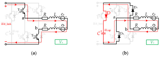 In order to achieve the effect of reducing torque ripple across the whole range, it can be seen from Figure 3 that the DC-link capacitor is discharged in Zone C, and the capacitor voltage is in a decreasing state. However, it is necessary to ensure that the high voltage required for the commutation period is still satisfied until the end of Zone C. For this reason, we chose to boost the energy storage of the DC-link capacitors in Zone B. In the DC-link boost energy storage mode, the effective vector is Vs, the charging vector is Vc, and the DC-link switch T is off. The vector equivalent electricity in this mode is shown in Figure 5a,b, respectively.