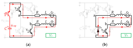 In the DC-link capacitor step-down mode, the effective vector is Ve, the zero vector is V0, and the DC-link switch T is on. The vector equivalent circuits of this mode are shown in Figure 6a,b, respectively.