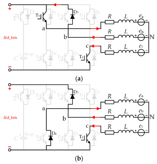 During the “a + b − → a + c −” commutation period, the equivalent circuit diagram is shown in Figure 7. Phase “a” is a non-commutation phase, phase “b” is a non-conducting phase, and phase “c” is a conducting phase. The negative conducting current switches from phase “b” to phase “c”. The equivalent circuit diagram is shown in Figure 7a when switches T1 and T2 are on. At the same time, ua = udc_link, ub = udc_link, uc = 0. The equivalent circuit diagram is shown in Figure 7b when the switch T1 is off and the switch T2 is on. At the same time, ua = 0, ub = udc_link, uc = 0.