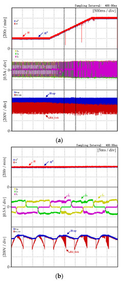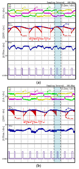 Figure 12b shows zoomed-in waveforms of dynamic experimental results of the motor speed in Figure 12a. As the motor speed increased, the amplitude of the phase back-EMF increased, and the DC-link capacitor voltage did not meet Equation (16). It can be seen from the Figure 12 that when the motor speed rises to about 400 r/min approximately, the DC-link boost energy storage mode begins in Zone B, and the DC-link capacitor meets the high voltage required during commutation period. The commutation torque ripple can be reduced.