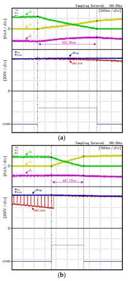 Figure 10a,b are, respectively, the amplified waveforms of Figure 9a,b during the same commutation period. The experimental waveforms shown in Figure 10 from top to bottom are, respectively, the three-phase current of the motor, the DC-link voltage UD_link and the commutation signal com.