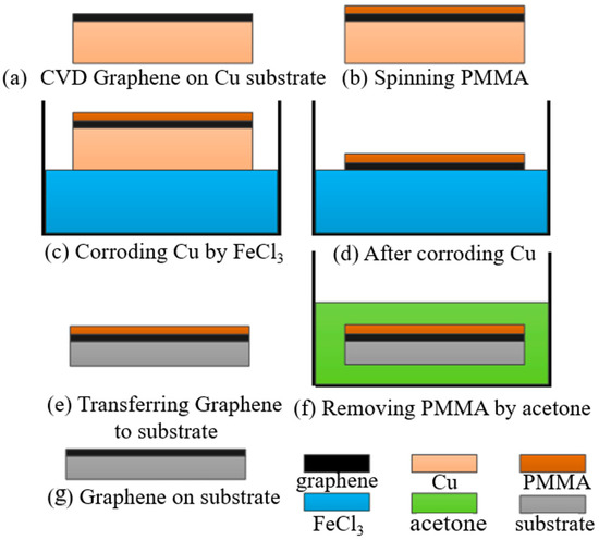The graphene film used in the experiment was prepared by the CVD method and deposited on copper. The PMMA-assisted wet transfer method was adopted. Firstly, 4 g of PMMA powder was weighed and placed in a brown, wide-necked bottle. Then, 100 mL of benzaldehyde solution was poured into the bottle, and the bottle was heated in a water bath at 50 °C and magnetically stirred for 6 h. The PMMA was prepared by spin coating onto the graphene surface by a homogenizer and was heated and cured at 180 °C for 3 min. Next, 1 mol/L of FeCl3 solution was prepared. Due to its ultra-thin characteristic, graphene will quickly adsorb impurities, such as molecules and particles, in an aqueous solution. So, a dust-free cloth was used to filter the impurities on the solution surface. The residual FeCl3 contaminants in the graphene film were neutralized by 10–20%-diluted hydrochloric acid for 1 h and then further cleaned with deionized water. The substrate was washed with deionized water and acetone successively, and deionized water was finally used to reduce ion pollution. Then, the graphene/PMMA was transferred to the substrate and let stand to naturally dry. Finally, the PMMA was removed by acetone to complete the transfer process of graphene film. The specific steps of the operation are shown in Figure 1.