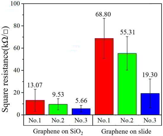 Graphene was transferred to glass slides and SiO2 substrates. On different substrates (SiO2 and glass), three groups of samples, named “No.1”, “No.2” and “No.3”, were prepared. Using an HPS2661 four-probe resistance measuring instrument (produced by Helpass Electronic Technologies), each sample was measured five times and its square resistance was indicated by an error bar. The test results of the different substrates are shown in Figure 2. It was found that the resistances between the same kind of substrate were significantly different, and the minimum resistance values of different substrates were several times different. As shown in Figure 1, on the slide, the minimum resistance of graphene was 19.30 kΩ/□ and the maximum resistance was 68.80 kΩ/□; on the SiO2 substrate, the minimum square resistance was 5.66 kΩ/□ and the maximum square resistance was 13.07 kΩ/□. It can be concluded that the square resistance of the graphene transferred to the SiO2 substrate was lower than that transferred to the glass substrate. In addition, the square resistances of various samples on like substrates were different.