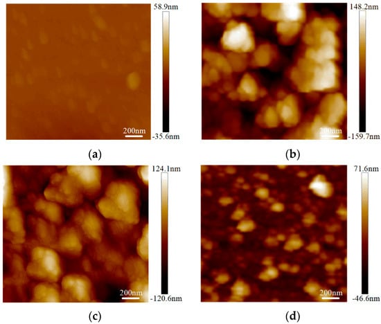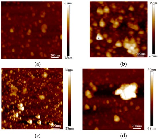 The surface roughness tests were conducted on the graphene on the SiO2 substrate by AFM with an Innova-IRIS atomic force microscope (Bruker Nano Surfaces co., Ltd., Billerica, MA, USA). Bare SiO2 was used as a blank control group in the experiment. As shown in Figure 3, there were almost no noticeable particles on the bare SiO2 substrate. In the No.3 sample on the SiO2 substrate particles were evenly distributed and its flatness was average. There were some large particles in the No.2 sample on the SiO2 substrate. For the No.1 sample, the surface was more uneven. The surface roughness was obtained with the NanoScope analysis software. The surface roughness, expressed as Ra),of the bare SiO2 substrate was 1.23 nm, the Ra of the No.3 sample on the SiO2 was 4.65 nm and the Ra of the No.2 and No.1 samples on SiO2 were 6.71 nm and 7.86 nm, respectively. From Figure 4, we can see that the surface roughness of the glass substrate was similar to that of the SiO2 substrate. The surface roughness of the sample with the lowest square resistance (Figure 4d) was less than the other two experimental samples. The Ra of the bare glass slide was 25.68 nm. The Ra of the No.1, No.2 and No.3 samples were 70.14 nm, 58.23 nm and 30.26 nm, respectively.
