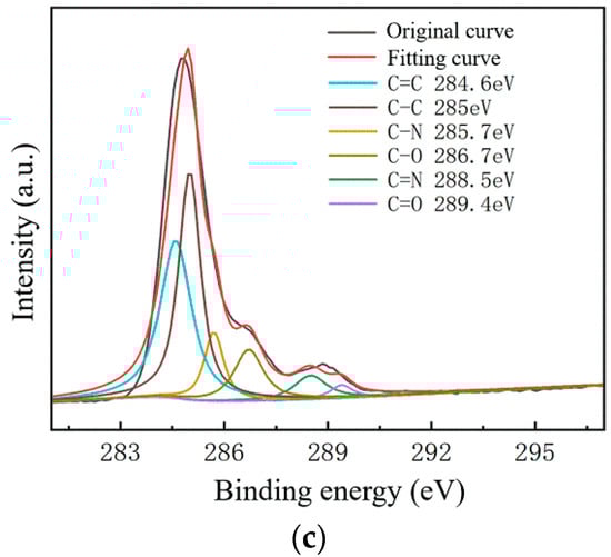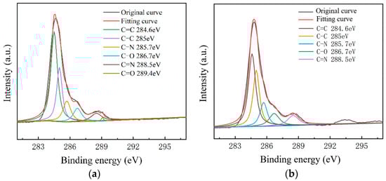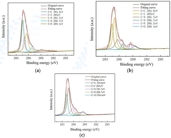 To further study the influence of graphene surface impurities on the electrical properties of the obtained graphene, it was necessary to analyze the graphene surface in the X-ray energy spectrum, for which we used an ESCALAB Xi+ X-ray photoelectron spectroscopy (Thermo Fisher). The contents of the elements C, N and O on the surfaces of the experimental samples after transfer were measured by XPS analysis, and information of the various elements’ peaks was obtained. The C1s peak is the most significant peak for the analysis of doping substances. Therefore, the C1s peak was processed by XPS peak separation. The chemical bond composition of C in the C1s peak was analyzed as the baseline for introducing impurity species during the graphene transfer process. Different substrate samples are selected for analysis, as shown in Figure 8 and Figure 9.