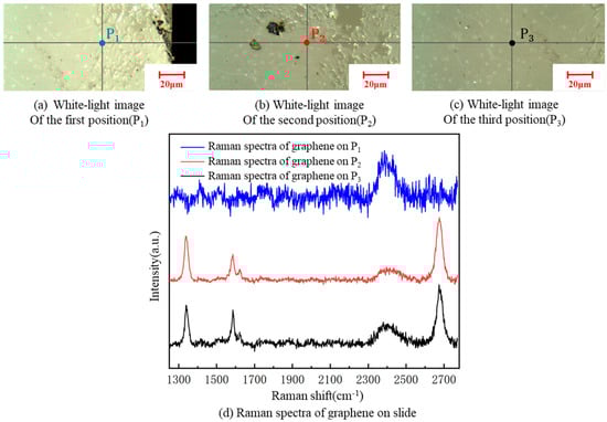 A white-light image of three different positions on the slide substrate (a–c). Raman spectra of graphene at the three positions on the slide (d).