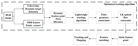 Because some potential dynamic objects in the environment and some blurred moving objects in the image may not be detected by the object detection network, the quasi-static feature points derived after the first filtering will be used to match the feature points. Then, according to the feature point matching results, the essential matrix between two images can be obtained by the RANSAC algorithm. Next, the epipolar geometric constraints and LK optical flow method can be adopted in series to detect and remove the potential dynamic feature points. Finally, only the remaining static feature points are used to estimate the pose between adjacent frames. The flow chart of the improved algorithm discussed in this paper is shown in Figure 1.