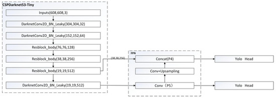 The YOLOv4-tiny structure is a simplified version of YOLOv4, which is a lightweight model. There are only 6 million parameters, which is equivalent to one-tenth of the original, which greatly improves the detection speed. The overall network structure has a total of 38 layers, using three residual units. The activation function uses LeakyReLU, the classification and regression of the target are modified to use two feature layers, and the feature pyramid (FPN) network is used when merging the effective feature layers. It also uses the CSPnet structure, and performs channel segmentation on the feature extraction network. The feature layer channel output after 3 × 3 convolutions is divided into two parts, and the second part is used. On the COCO dataset, 40.2% AP50 and 371FPS were obtained, indicating a significant performance advantage over other versions of lightweight models. Yolov4-Tiny object detection network is used for object detection experiment, and the results are shown in Figure 2. The structural diagram of this model is shown in Figure 3 below [14,15].