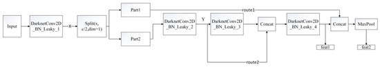 As shown in Figure 3, the backbone network of Yolov4-Tiny, i.e., CSPDarknet53-Tiny, is composed of the Resblock_body module and the DarknetConv2d_BN_Leaky module. DarknetConv2d_BN_Leaky mainly contains of a two-dimensional convolution module, and the standardization and activation function Leaky ReLU. The CSPNet structure is introduced into the Resblock_body module as shown in Figure 4. The trunk part of the module is still the conventional stacking of residual modules, but a long-span residual edge is introduced in the branch part. The residual edge is first processed by a small amount of convolution, and then directly connected to the module. Next, it is concatenated with the output of the trunk part in the channel dimension. Finally, the output of the module is processed by the 2 × 2 maximum pooling layer.