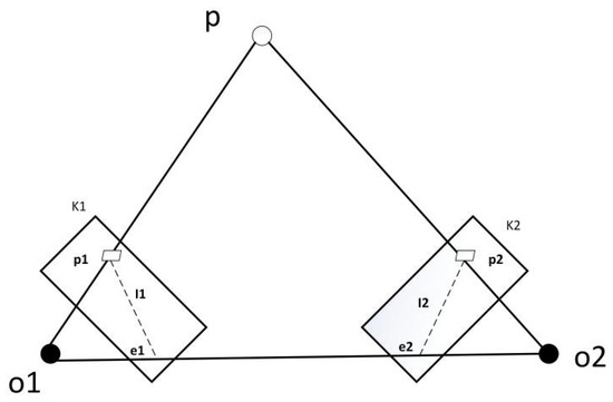 As shown in Figure 5, firstly, denote the pair of matching points in the current frame and the reference frame as p 1 and p 2 , respectively. P 1 and P 2 are the corresponding homogeneous coordinate forms: