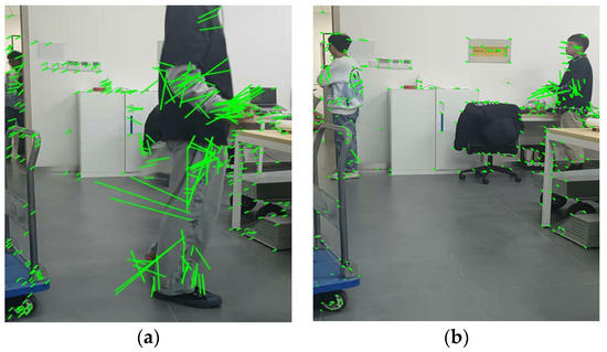 Figure 6. The results of using the optical flow method to detect dynamic feature points. (a) Result 1; (b) Result 2.