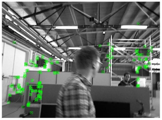 Because Yolov4-Tiny is a lightweight network, part of the detection accuracy is sacrificed to improve the running speed of the algorithm. To make up for the loss of detection accuracy, this paper introduces pole-constrained geometry and the optical flow method, which are introduced to further detect the dynamic objects in the environment and filter out dynamic feature points thoroughly. Figure 7 and Figure 8 below illustrates the filtering of dynamic objects from the freiburg3_Walking_xyz highly dynamic scene sequence in the TUM dataset. One of the men in the picture is walking randomly [28,29,30]. Figure 7 is the result of traditional orb-slam2 without dynamic feature point filtering, and Figure 8 is the result of dynamic feature point filtering.