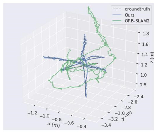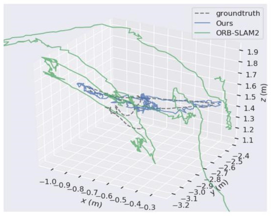 Figure 9. The comparison of our algorithm’s trajectory with ORB-SLAM2’s when applied on walking_xyz from the TUM dataset.