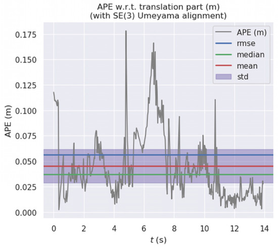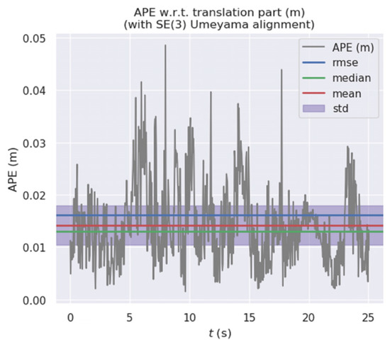 In this paper, six datasets from the TUM dataset are used for experimental verification, including fr3_walking_xyz, fr3_walking_half, fr3_walking_static, fr3_walking_rpy, fr3_sitting_static and fr3_sitting_half. The datasets of walking_xx belong to a highly dynamic environment, and the datasets of sitting_xx belong to a low dynamic environment. The Evo tool is used to compare the camera pose estimated by the proposed algorithm with the real camera pose data provided in the dataset. The evaluation indicator is Absolute Pose Error (APE). The APE refers to the direct difference between the pose of the camera estimated by the algorithm and the real pose data. It directly reflects the accuracy of pose estimation and the consistency of the global trajectory of the camera. Meanwhile, Root Mean Square Error (RMSE) and Standard Deviation (STD) are used for evaluation. RMSE reflects the difference between the real value and the observed value. STD is used to evaluate the deviation between the camera’s estimated trajectory and the real trajectory, which can reflect the robustness and stability of the system. The mean and median can reflect the accuracy of pose estimation. For performance comparison, our algorithm is compared with the use of ORB-SLAM2 for the same dataset, and the experimental results are as follows.