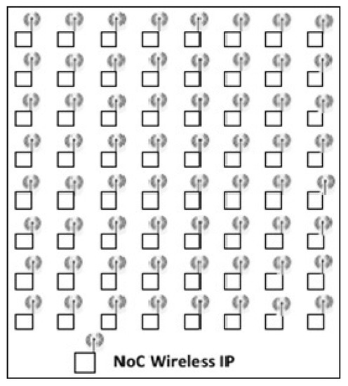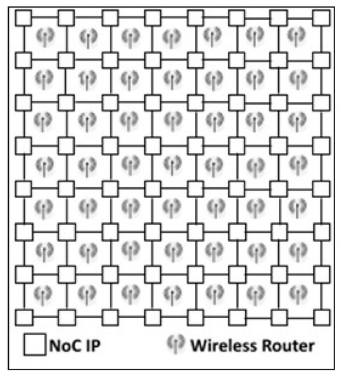A hybrid NoC consists of a two-level network. One level is a wired links network, which is intended for cases in which there is a reliably short-distance between the neighboring on-chip nodes, whereas the other level is a wireless link for distant communications, which can reduce latency and power efficiency, owing to single-hop communication between far IP cores, and which can enhance wireless bandwidth, limited by physical constraints for wired links. Figure 1 illustrates a generic example of an 8 × 8 2D mesh WiNoC topology based on 4 × 4 wireless hubs with wide-band antennas [14]. Each wireless hub is working as a router that allows single-hop communication between far-IP cores.