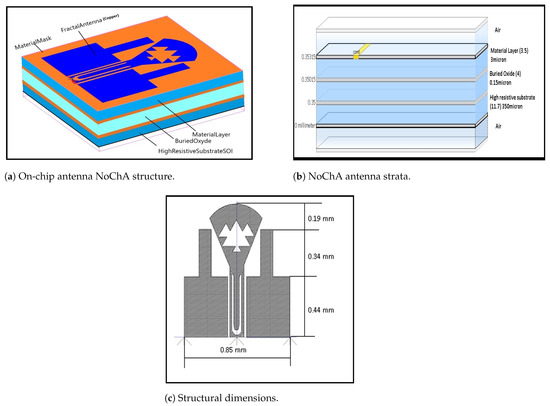 The antenna size is reduced accordingly with the transmission frequency increase. Since the on-chip IP-cores are about 5 to 25 mm2, the designed antenna should occupy less than 1 mm2. Figure 3a represents an antenna with the different deployed layers where the conducting element is covered by air. Figure 3c provides the proposed antenna dimensions having a size of about [0.85 mm; 0.94 mm]. In Section 4.2, we explain how we have chosen these sizes. The fractal antenna technology [11] consists of a copper layer printed on a multi-layer substrate that includes a dielectric layer with a relative dielectric permittivity , a buried oxide layer with , a high-resistivity (HR) layer with , as shown in Figure 3b. The deployment of such a HR layer is well justified by its lower dielectric losses and its high capacity for antenna miniaturization.