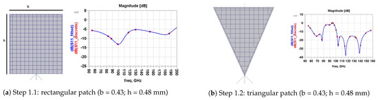 We designed our proposed antenna in four steps, as illustrated in Figure 4, Figure 5, Figure 6 and Figure 7. Each step is indicated via its value.The first step is shown in Figure 4. We intend the proposed antenna to operate in the range of (50–200) GHz; therefore, we began simulating a rectangular-patch antenna with h as the height and b as the width. These dimensions are approximated as follows (Figure 4a):