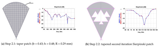 All these steps helped us to obtain an ameliorated version of our proposed antenna, with the following dimensions: , , µm; , µm; , µm; and , µm. The Sierpinski hollows are formed of four triangles, as shown in Figure 5b. The biggest one has a height and base of 188 and 233 µm, respectively; the smallest one has a height and base of 50 and 70 µm; and the two others have heights and bases of 95 and 125 µm.