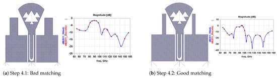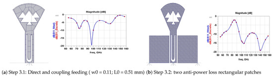 Figure 7 (step 4) demonstrates how we have limited more power losses by adding two other rectangular patches with different dimensions (, µm (Figure 7a) and , µm (Figure 7b)).