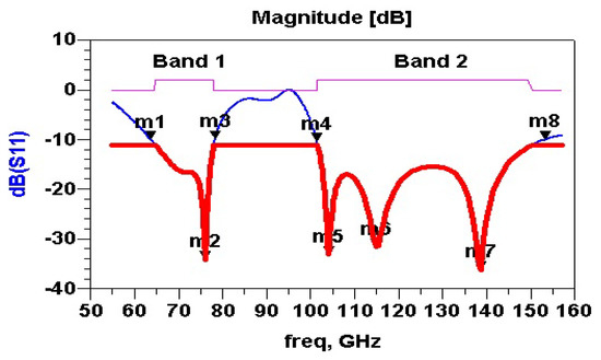 Figure 8 shows simulated parameters of the proposed fractal antenna. According to the −10 dB threshold (1/10 losses allowed), we distinguish two frequency bands as shown in Table 1—(m1, m3) and (m4, m8). However, when losses are required to be 1/100, the threshold must be less to −20 dB. Therefore, four bands are provided by our proposed antenna, centered around m2, m5, m6, and m7. The transmission coefficient will be considered in antennae networks treated via IP coupling in Section 5. Table 1 gives the values for eight critical frequencies from Figure 8.