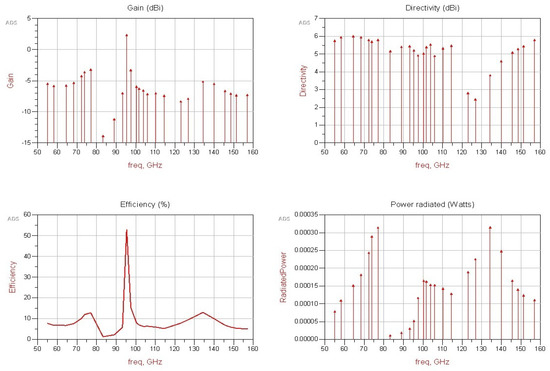 The efficiency is given by . Table 2 shows the antenna parameters depending on central frequencies, where the proposed antenna directivity is considerable but efficiency remains only acceptable and may be improved. G is the antenna gain given by Equation (5), and D is the directivity. This allows for deployment of the antenna even in a laminated on-chip structure (multi-layered).