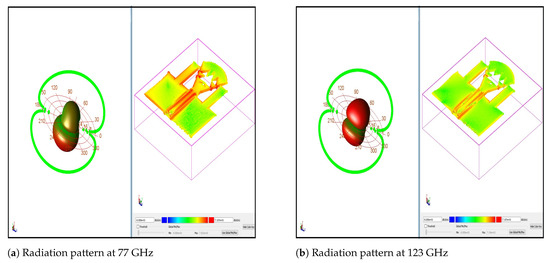 Radiation pattern at 77 GHz and 123 GHz (cut on ) and the current density scaled from −80 dB (A/m) (blue) to 71.8 dB (A/m) (red).