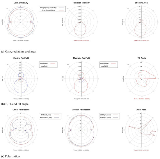 Figure 9 indicates the gain, directivity, efficiency, and radiated power. The curve (efficiency versus frequency) shows that the best efficiency is achieved at 95 GHz. The directivity is always in the range of 4–6 dBi for all the frequencies, except between 120 GHz and 130 GHz. However, radiated power (Watts) is sufficiently high, except between 80 GHz and 94 GHz, where gain and efficiency have the lowest values. Thus, gain is directly affected, and the best gain value is achieved when the efficiency has the highest value. Radiation patterns, as illustrated in Figure 10, prove how omni-directional the radiations are in several bands. In Figure 10b, we note that the radiation pattern at 123 GHz is better than that in Figure 10a at 77 GHz. We added the current density in two cases of GHz and GHz. We want to prove that the proposed antenna NoChA is radiating sufficiently to reach its neighbors, as we need it to operate in the NoC . Figure 11 and Figure 12 show the parameters of the proposed antenna in 77 GHz and 123 GHz, respectively, chosen from the bi-bands and .